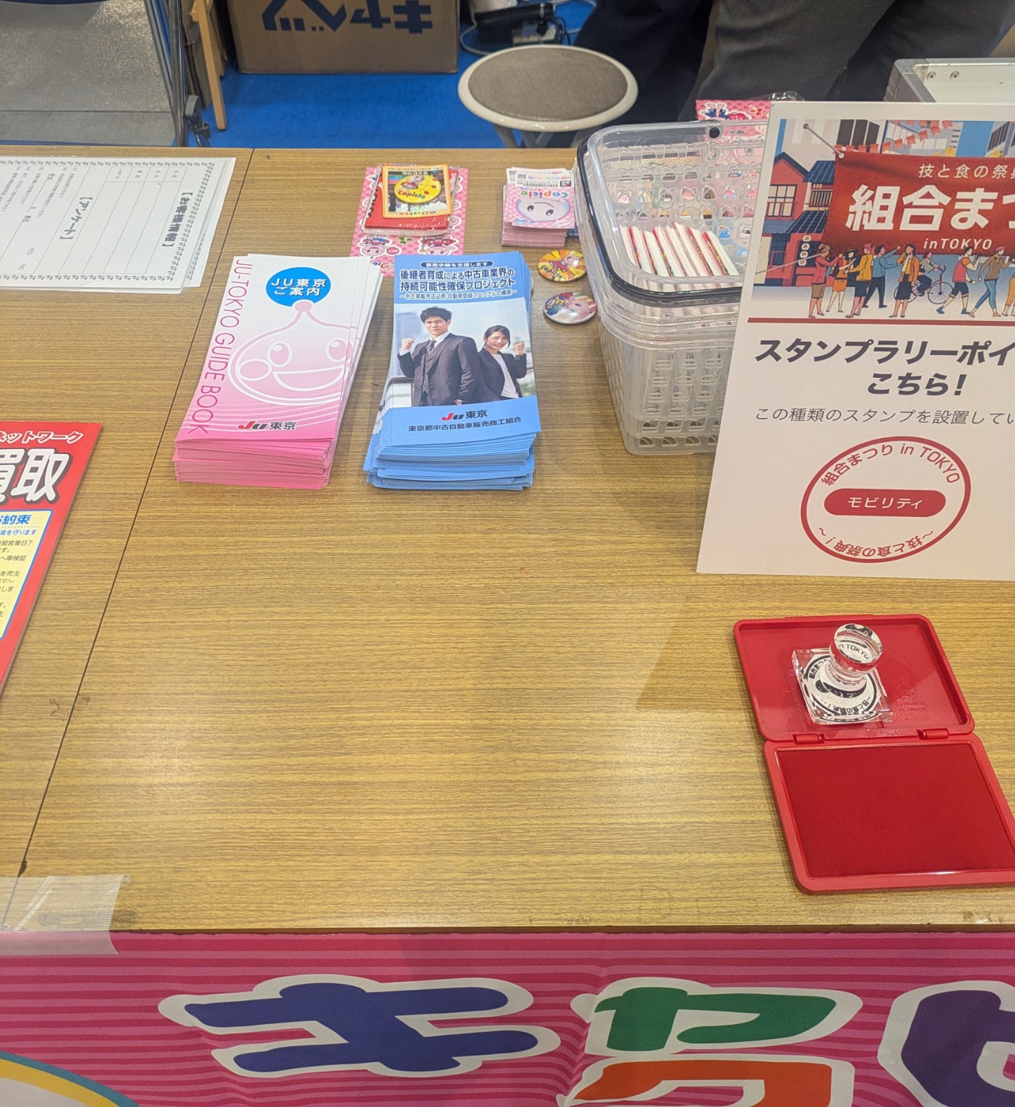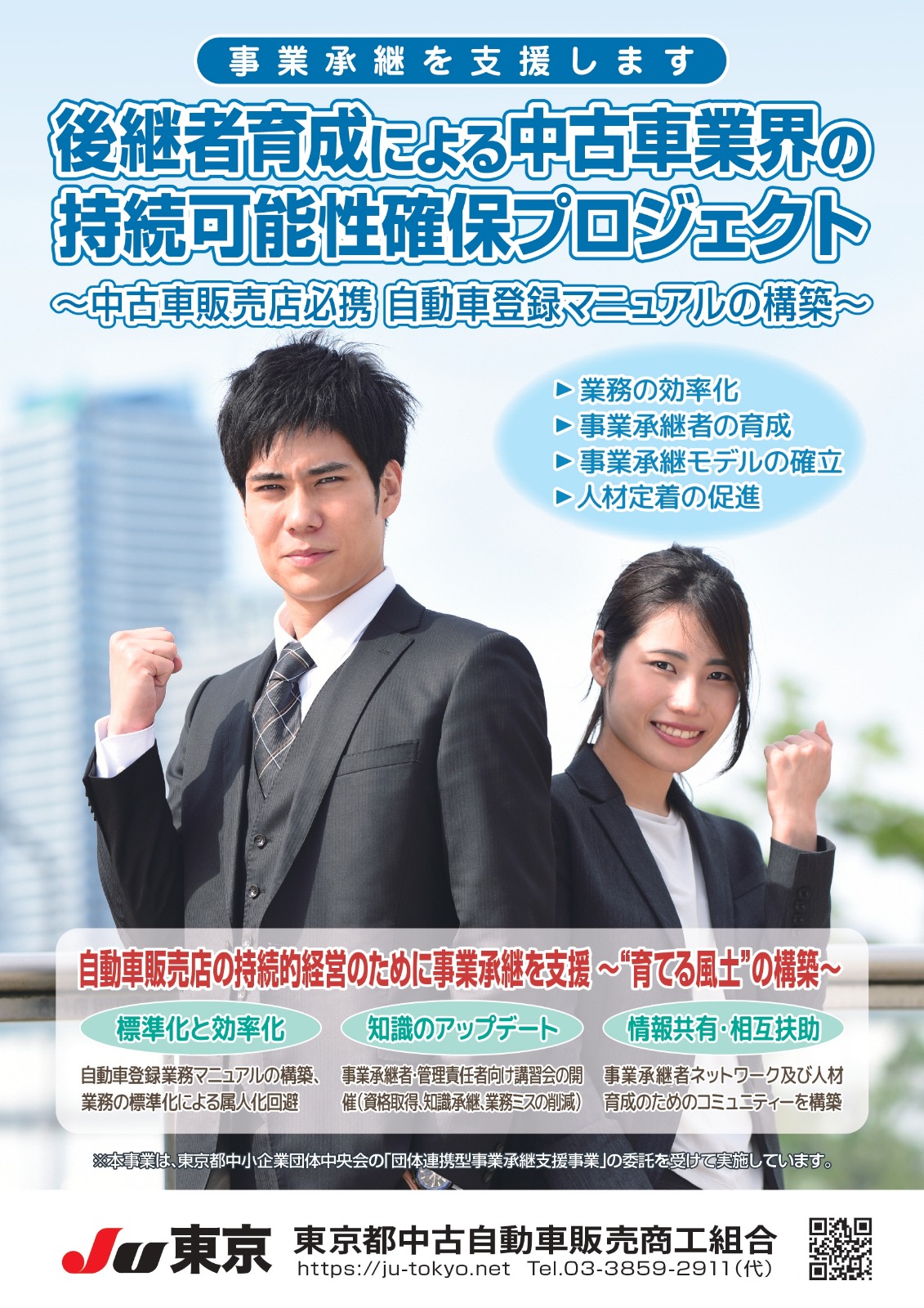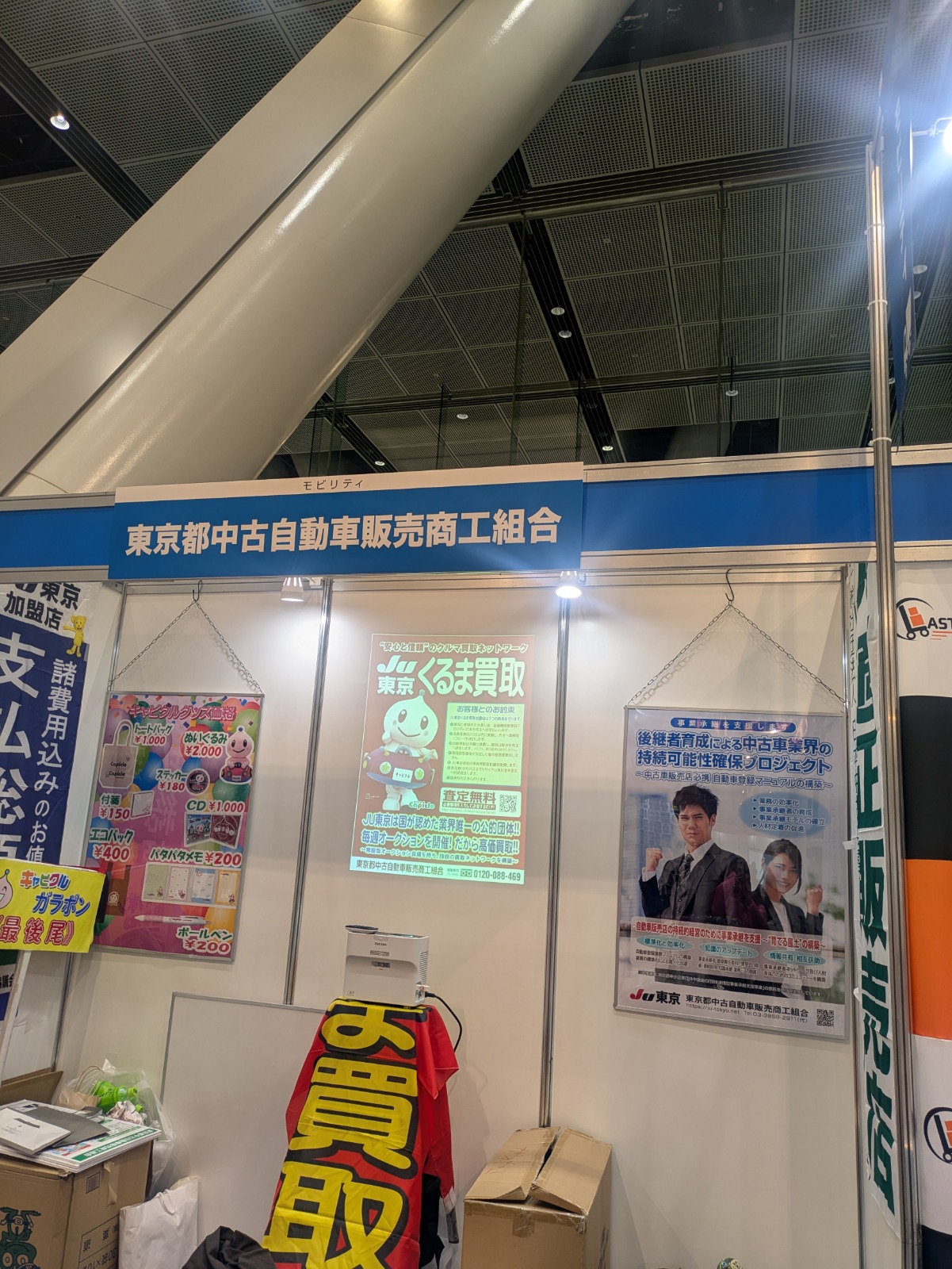 JU東京のブースでは、くるま買取り、総額表示のお店はJU東京の加盟店に!をPRし、東京都・東京都中小企業団体中央会の「団体連携型事業承継支援事業」の委託を受けて事業承継支援に取り組んでいる「後継者育成による中古車業界の持続可能性確保プロジェクト・中古車販売店必携自動車登録マニュアルの構築」について、ポスターを掲示、リーフレットを配布しました。