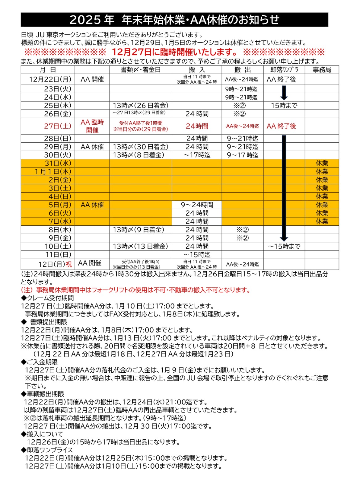 平素は格別のご高配を賜り厚く御礼申し上げます。誠に勝手ながら、12月29日(月)「2025年さよならAA」の開催日を12月27日(土)に変更させていただきます。また年末年始ですが以下の期間を休業とさせていただきます。 【冬季休業】 2025年12月31日(水)~2026年1月7日(水) 期間中は何かとご迷惑をおかけしますが、ご了承の程宜しくお願い申し上げます。