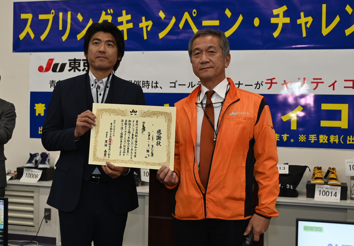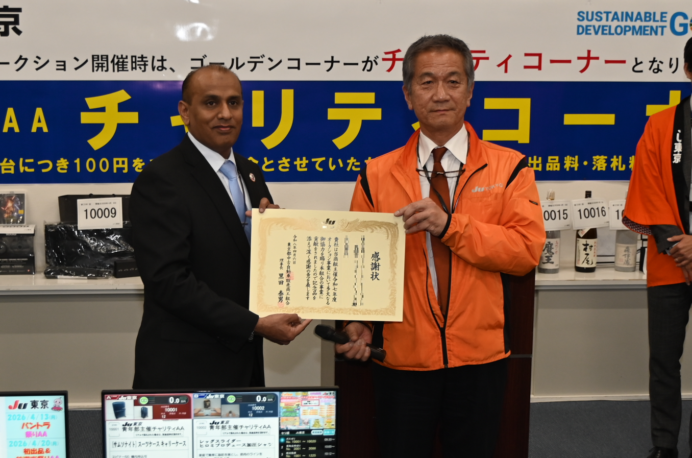4月6日(月曜日)令和8年度最初のオークション「JU関連協リレー・青年部主催チャリティ記念AA」が開催されました。オープニングセレモニー内で前年度の出品・成約・落札の部門で優秀な実績を残した会員を表彰する「令和7年度 優績社表彰」が行なわれ、黒田会長から表彰状と感謝の言葉が贈られました。